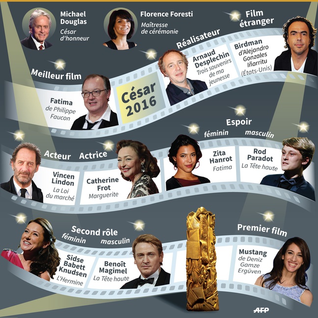 Cette année, la 41e cérémonie des César du cinéma, organisée par l'Académie des arts et techniques du cinéma, a eu lieu vendredi 26 février au théâtre du Châtelet à Paris pour récompenser les films sortis en 2015.